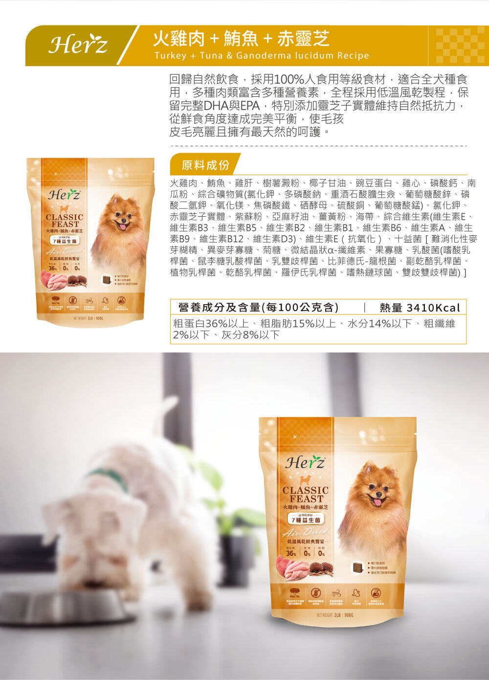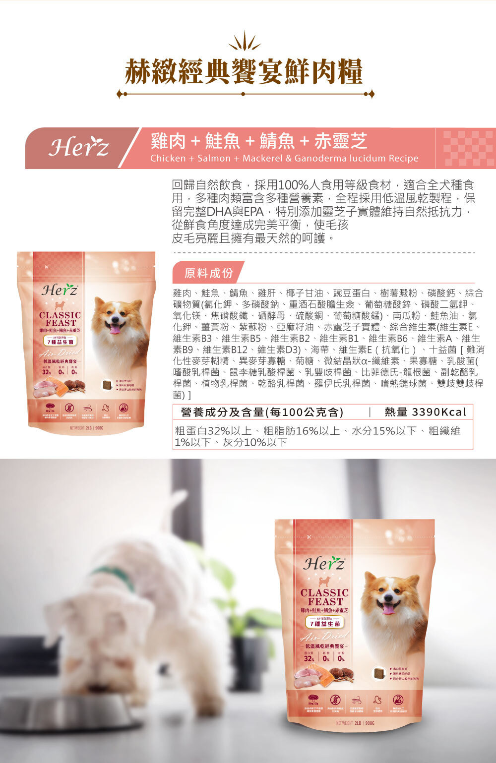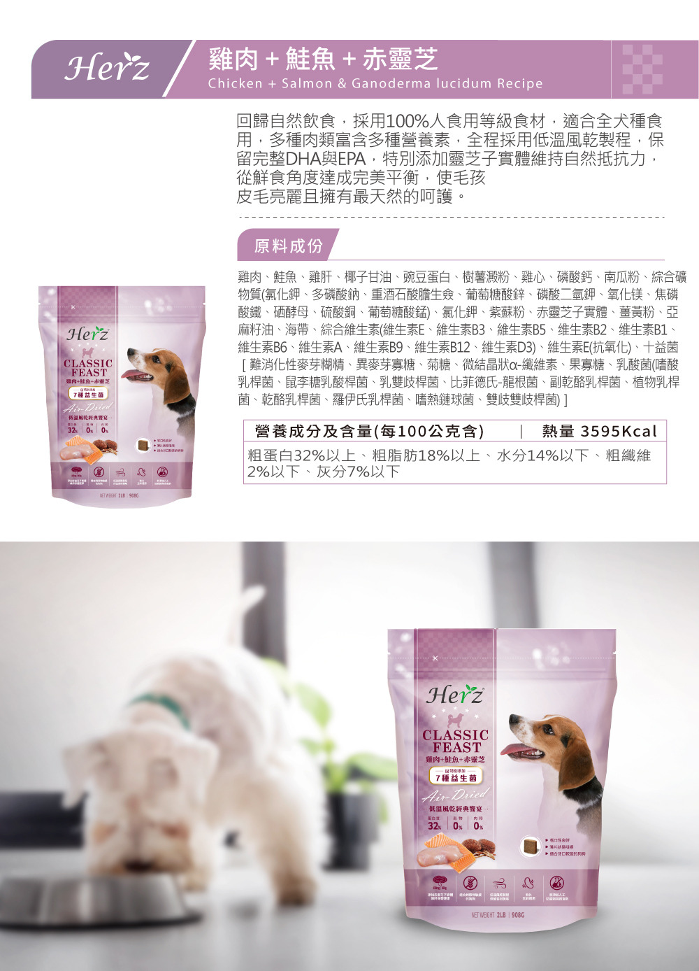 品名:赫緻®經典饗宴鮮肉糧-雞肉+鮭魚+赤靈芝