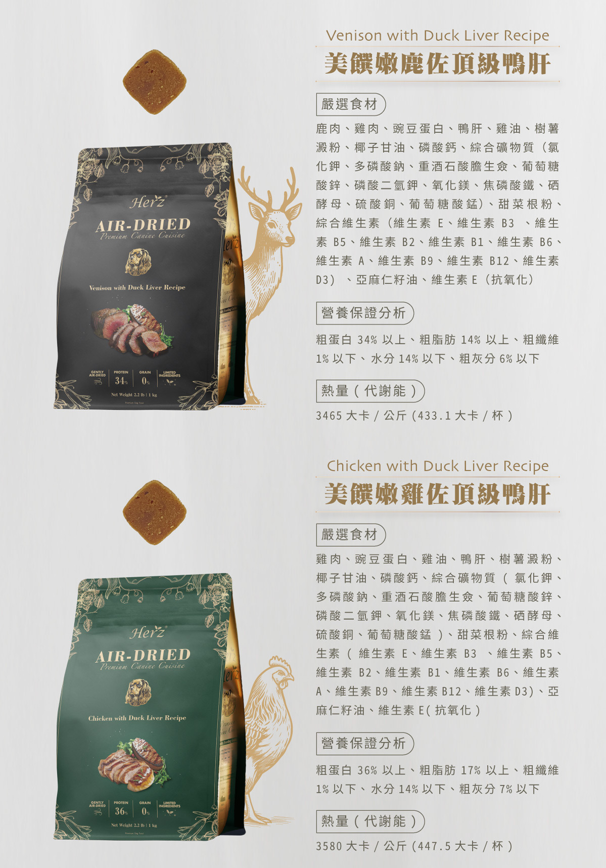 成分:鹿肉、雞肉、豌豆蛋白、鴨肝、樹薯澱粉、椰子甘油、磷酸鈣、綜合礦物質(氯化鉀、多磷酸鈉、重酒石酸膽生僉、葡萄糖酸鋅、磷酸二氫鉀、氧化鎂、焦磷酸鐵、硒酵母、硫酸銅、葡萄糖酸錳)、甜菜根粉、綜合維生素(維生素E、維生素B3 、維生素B5、維生素B2、維生素B1、維生素B6、維生素A、維生素B9、維生素B12、維生素D3)、亞麻仁籽油、維生素E(抗氧化)